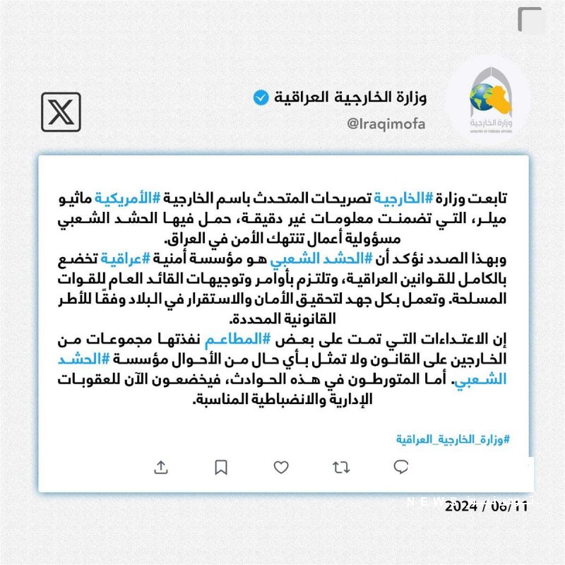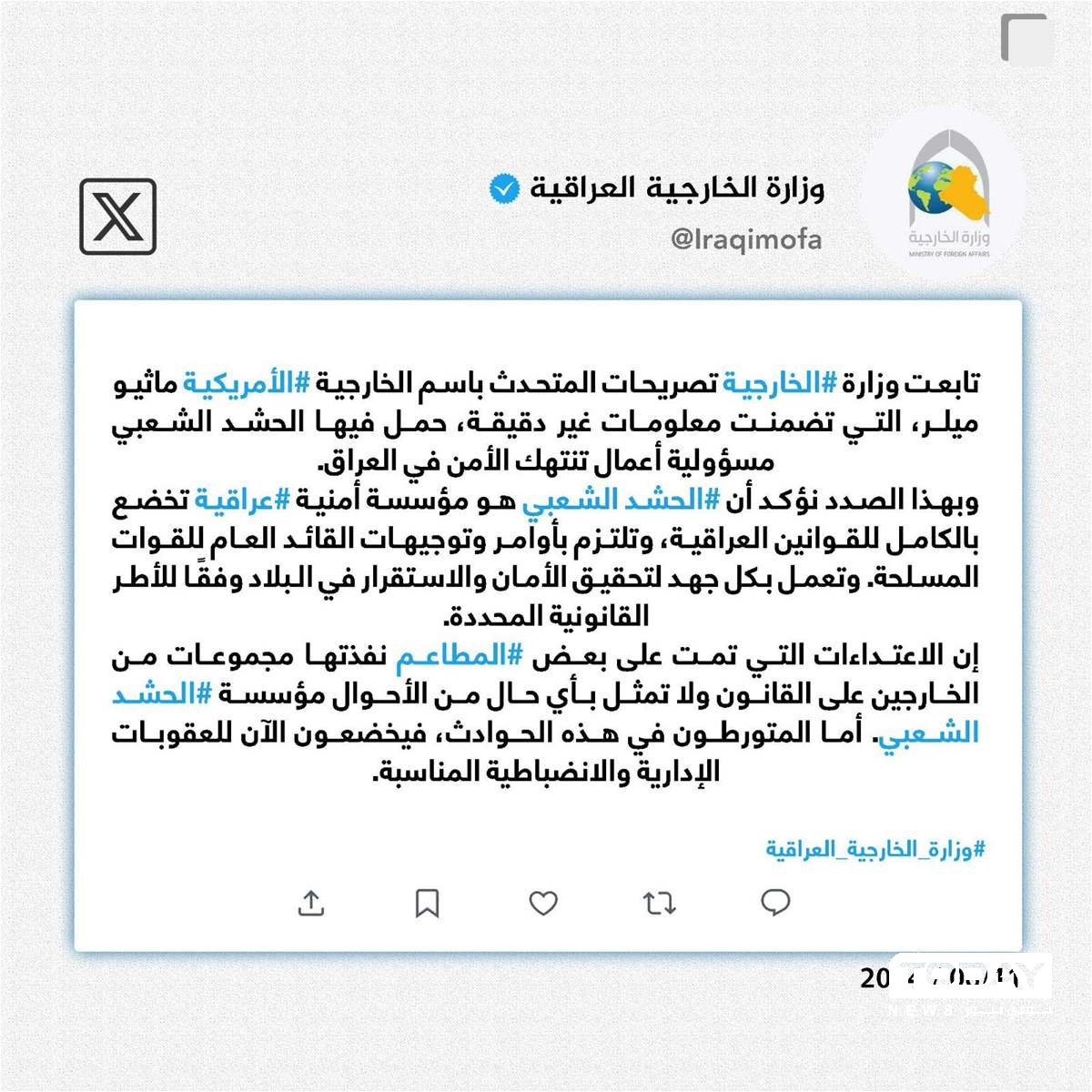 الخارجية ترد على مسؤول امريكي .. لا علاقة للحشد بهجمات المطاعم
