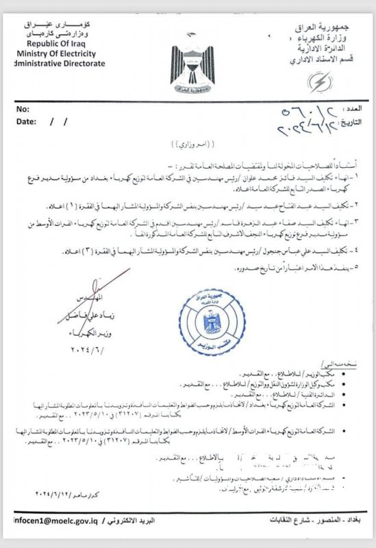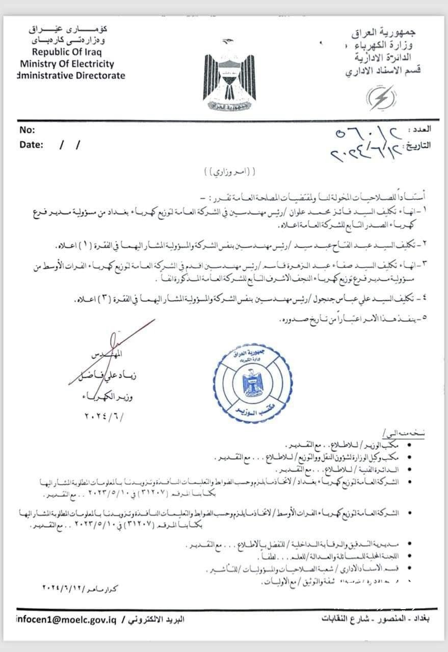 وثيقة : وزارة الكهرباء تجري جملة من التغييرات الادارية