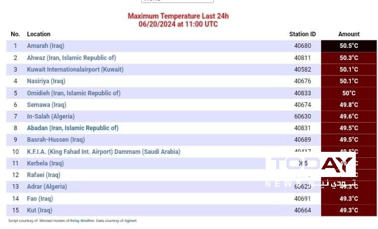 واحتلت مدينة العمارة في العراق المرتبة الأولى في أعلى معدل بدرجات الحرارة على مستوى العالم بأسره.