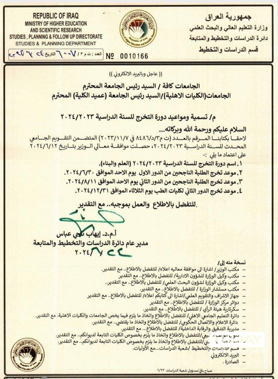 وبينت الوزارة في كتاب رسمي ، أن "اسم دورة التخرج هو (العلم والبناء)"، مشيرة الى أن "موعد تخرج الدور الاول 30 حزيران، اما الدور الثاني فموعده 11 اب 2024".