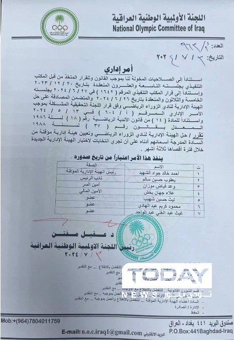 قررت اللجنة الاولمبية العراقية، اليوم الأربعاء، تسمية الهيئة المؤقتة لنادي الزوراء الرياضي بعد الموافقة على حل الإدارة التي كانت مسؤولة عن النادي.
