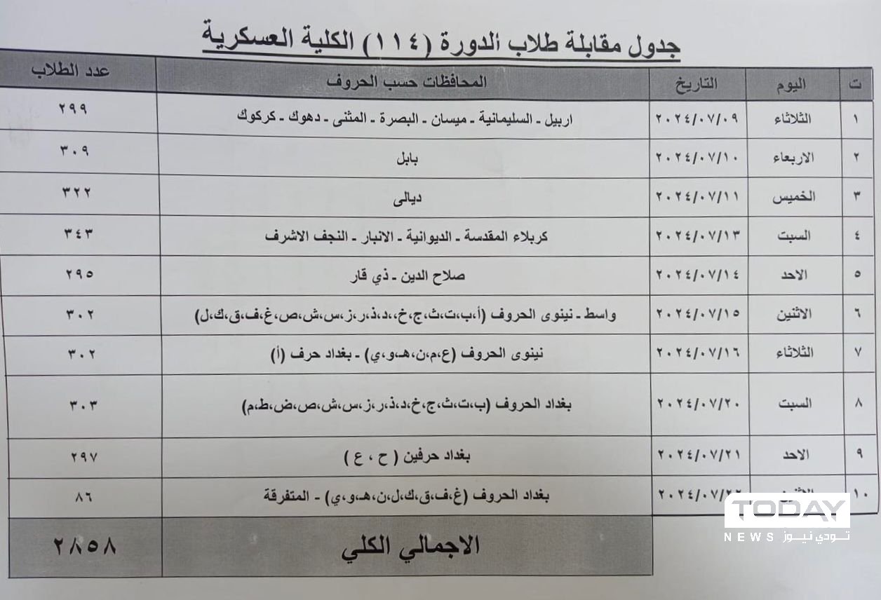 وقال بيان للوزارة، "ندعو الطلاب المتقدمين للدورة (114) الذين اجتازوا كافة الاختبارات البدنية والتنافسية والفحص الطبي النهائي بنجاح، الى مراجعة مقر الكلية العسكرية الكائن في بغداد (الرستمية)، لغرض اجراء المقابلة النهائية حسب المواعيد الواردة في الجدول المرفق ادناه، للفترة من 9 تموز الجاري ولغاية 22 تموز 2024".