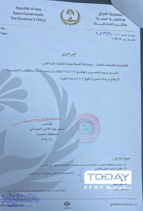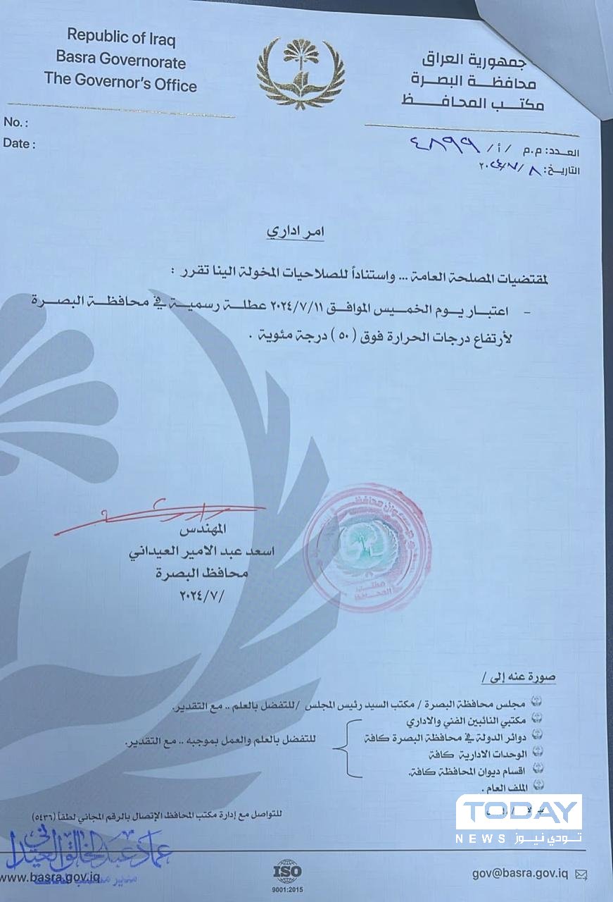 تعطيل الدوام الرسمي في البصرة يوم الخميس المقبل .. والسبب ؟