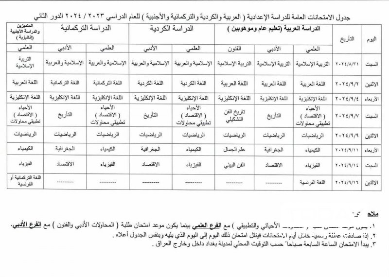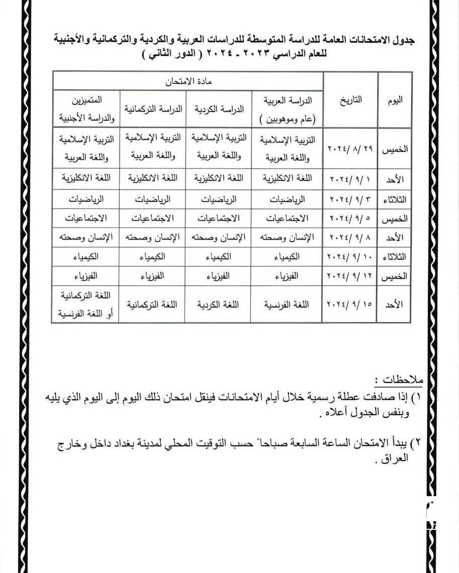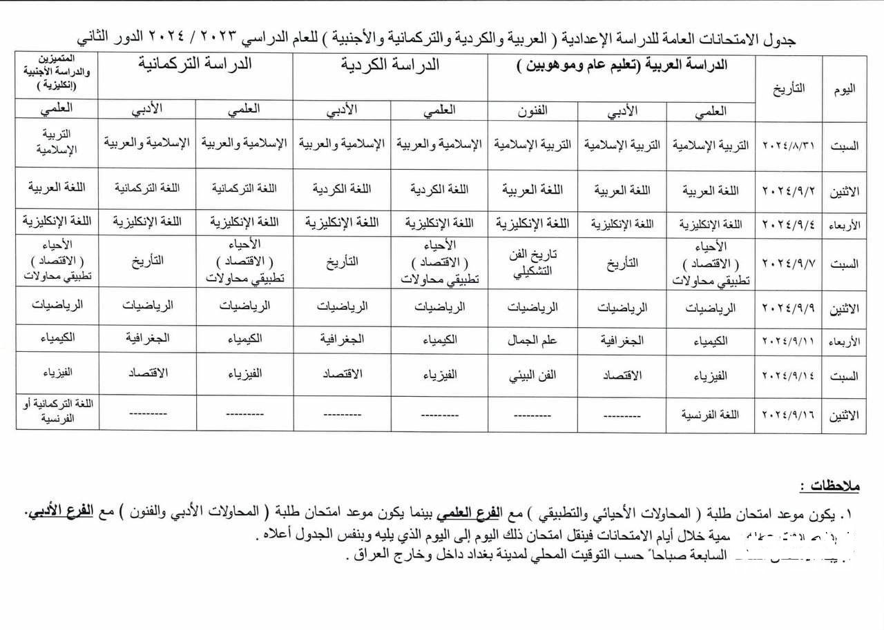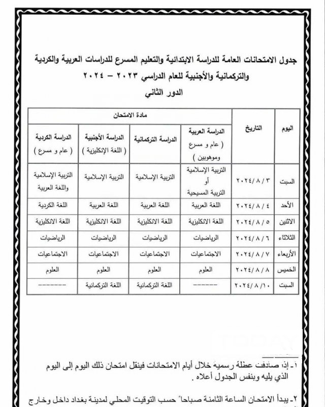 وذكر بيان للوزارة تلقت TodayNews نسخة منه،أن"وزارة التربية، أعلنت اليوم جداول الامتحانات الوزارية / الدور الثاني / لمراحل ( السادس الابتدائي ، الثالث المتوسط ، السادس الإعدادي ) للعام الدراسي 2023-2024".