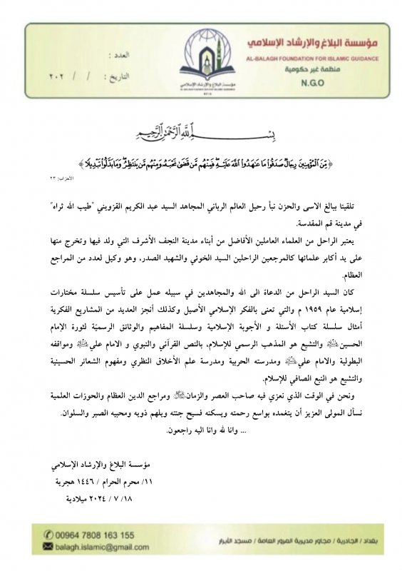 مؤسسة البلاغ والإرشاد الإسلامي تنعى العلامة السيد "عبد الكريم القزويني"