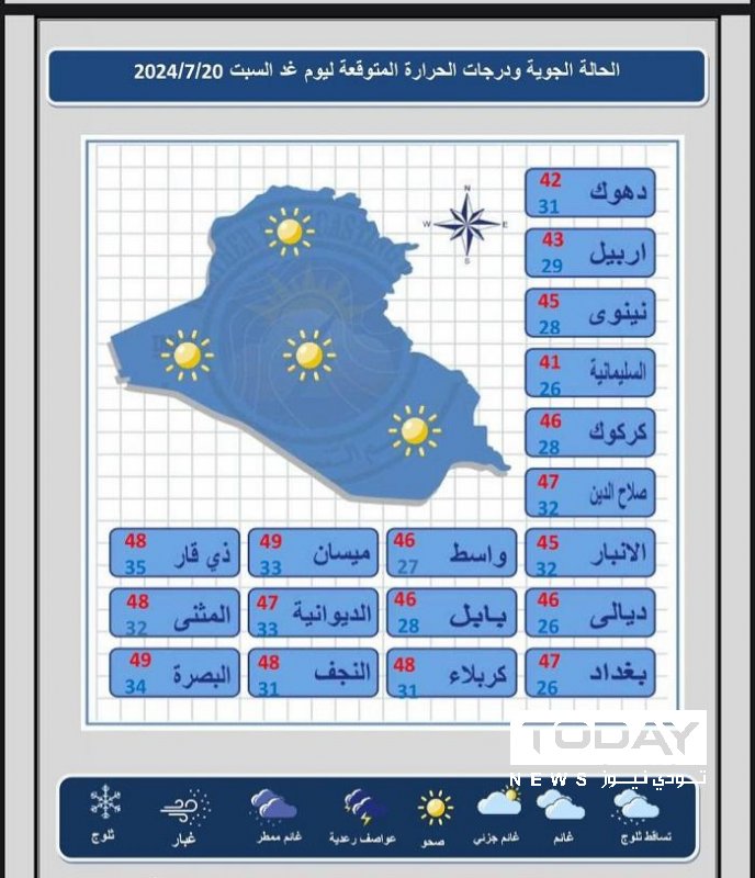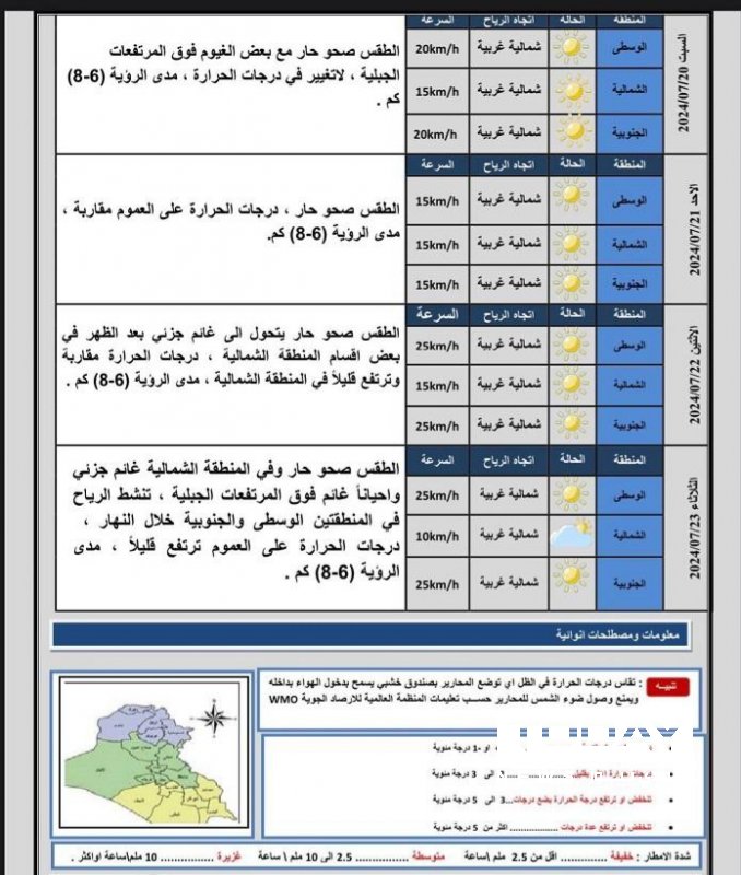 وبحسب النشرة الجوية للهيئة فان درجات الحرارة تعود الى الارتفاع بعد انخفاض نسبي فيها خلال الأيام الماضية، لتلامس مجدداً حاجز الـ 50 مْ لاسيما في المحافظات الجنوبية.