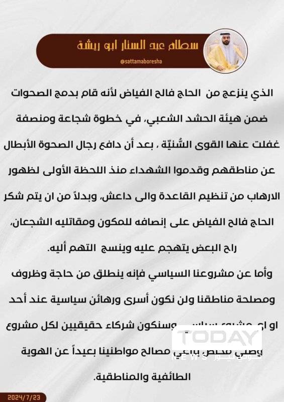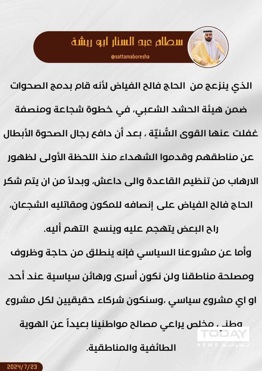 اعرب الشيخ سطام ابو ريشة، اليوم الثلاثاء، عن استيائه من رئيس حزب تقدم محمد الحلبوسي بعد نشر الاخير بيان يتضمن اساءة الى رئيس الحشد الشعبي فالح الفياض.