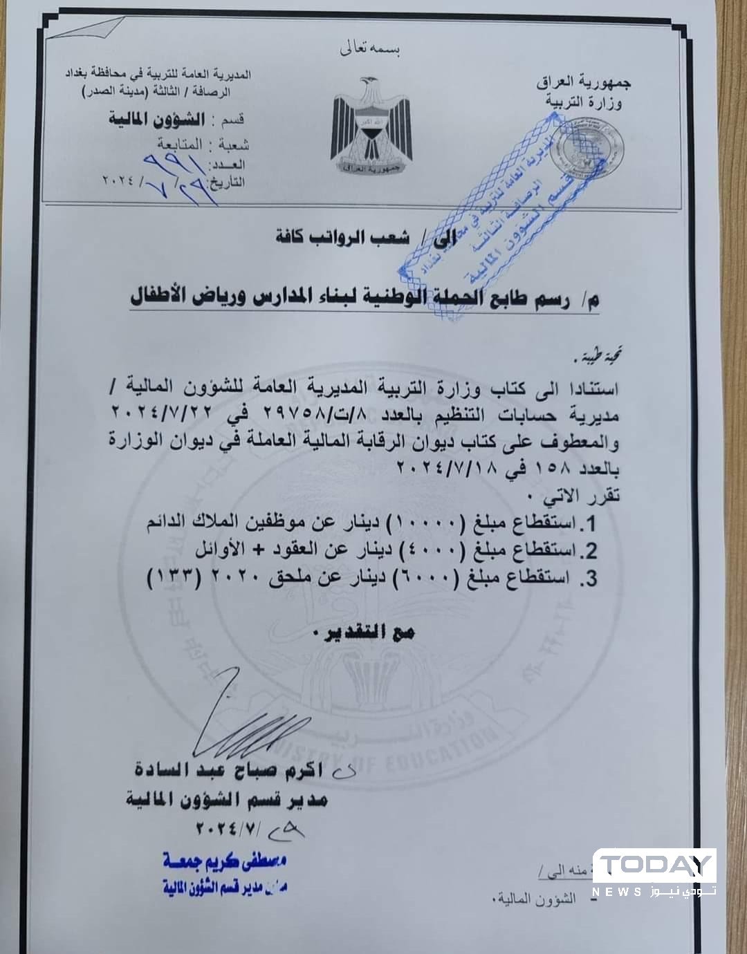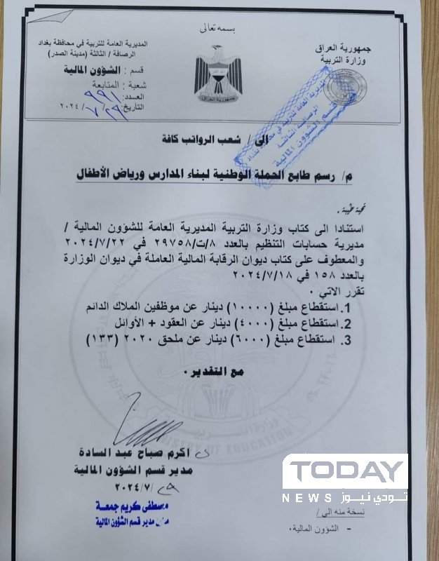 وثيقة : التربية تستقطع مبالغ من موظفيها لحملة بناء المدارس