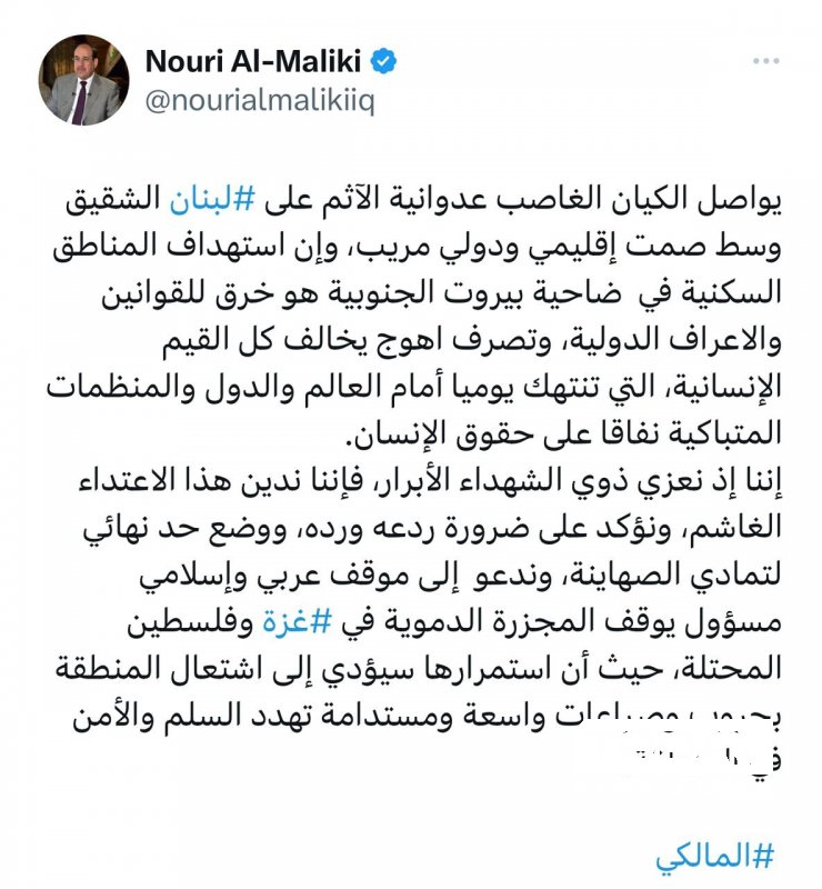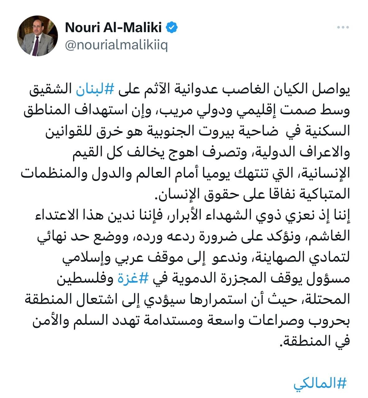 المالكي : استهداف المناطق السكنية في بيروت خرق للقوانين والاعراف الدولية