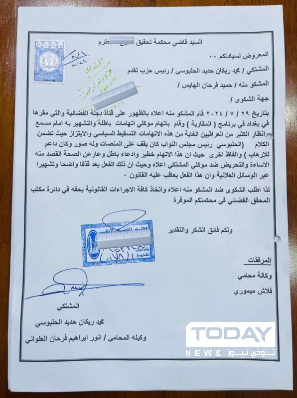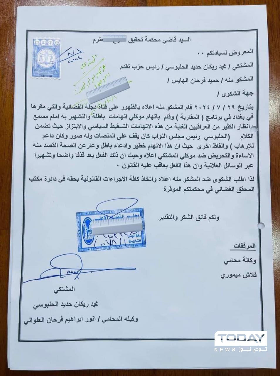 الحلبوسي يرفع دعوى قضائية ضد المدعو حميد الهايس بتهمة القذف والتشهير