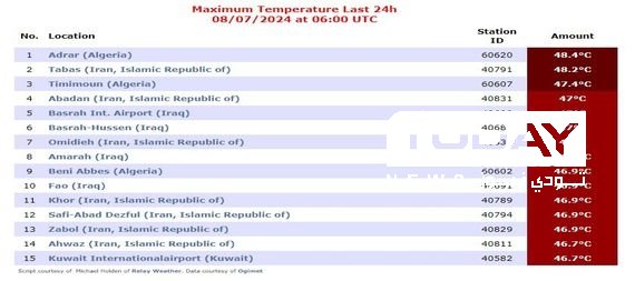 احتلت 4 مدن عراقية في تصنيف الأعلى حرارة بالعالم ضمن اعلى 15 مدينة بدرجات الحرارة .