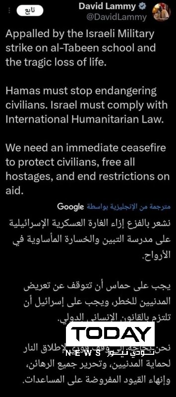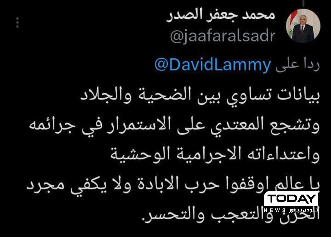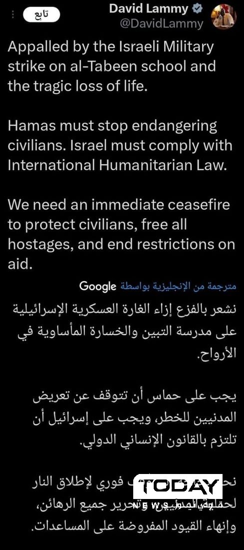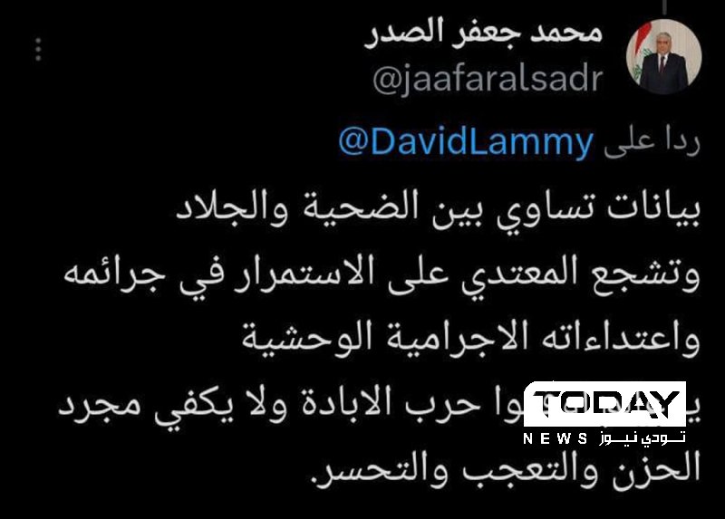 وجه سفير العراق لدى المملكة المتحدة محمد جعفر الصدر، السبت، انتقاداً لاذعاً لوزير الخارجية البريطاني ديفيد لامي على خلفية تصريحه حول القصف الإسرائيلي لمدرسة "التابعين" التي تؤوي نازحين في حي الدرج شرقي مدينة غزة، والتي راح ضحيتها أكثر من 100 فلسطيني وإصابة العشرات بجروح، فجر اليوم، داعياً إلى الوقف الفوري لإطلاق النار وعدم الاكتفاء بالتنديد والشجب.