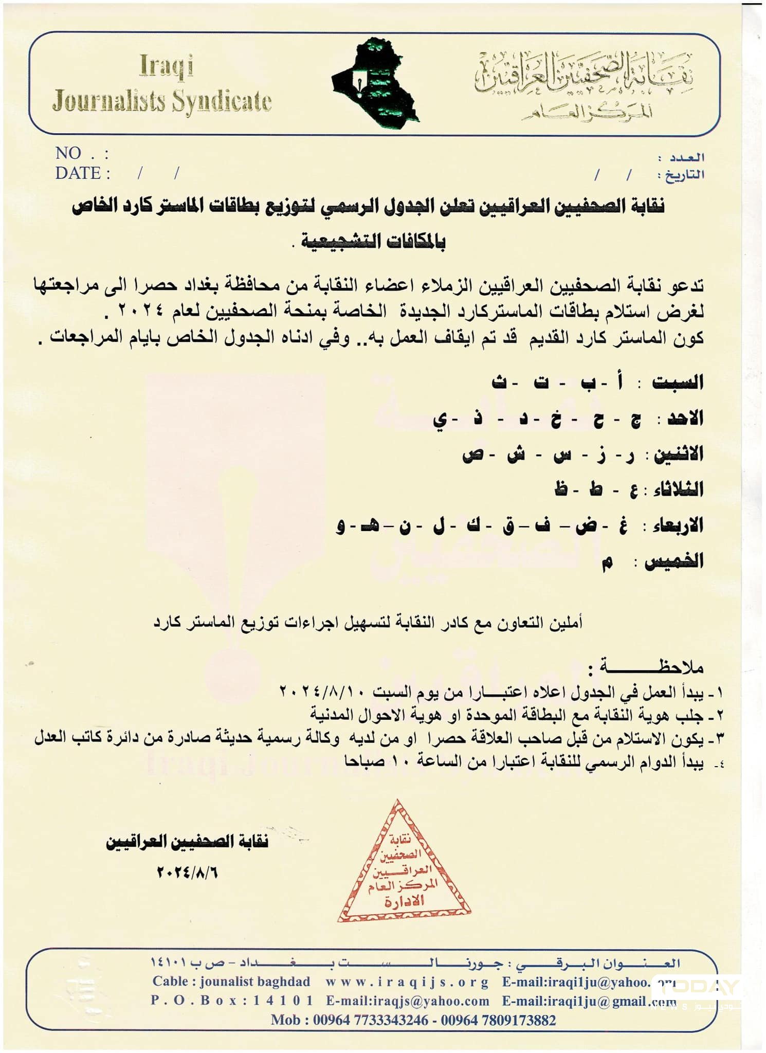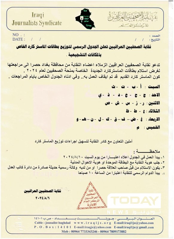 وأوضحت وثيقة للنقابة تلقت TodayNews، نسخة منها، أنه "يجب على المشمولين والذين سبق وان قدمو على المنحة لعام 2024 استلام البطاقة الجديدة كون البطاقة السابقة تم ايقاف العمل بها".