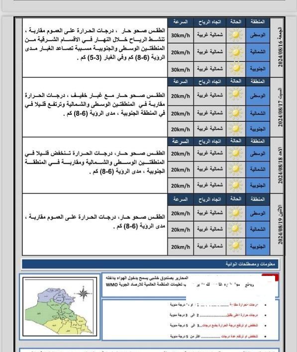 توقعت هيئة الأنواء الجوية والرصد الزلزالي، طقساً حاراً واحياناً مع غبار خفيف خلال الأيام الأربعة المقبلة.