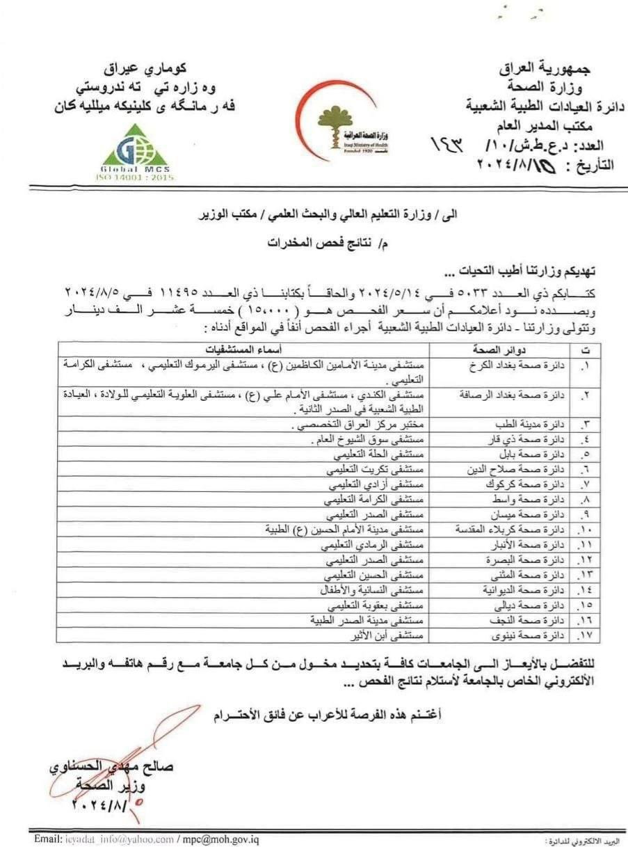 وثيقة.. الصحة تحدد سعر 15 الف دينار لفحص تعاطي المخدرات