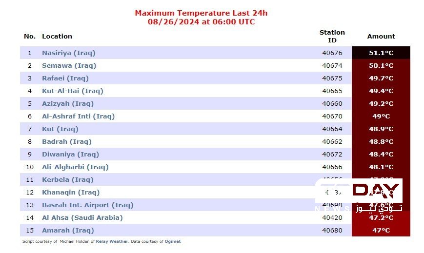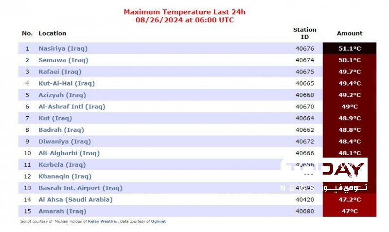 وبحسب مرصد كاليفورنيا، فأن العراق تصدر دول العالم بارتفاع درجات الحرارة حيث سجلت 14 مدينة ما بين 47 الى 51 درجة مئوية.
