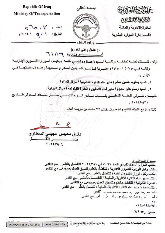 وكانت وزارة النقل قد أعلنت يوم السبت، 31 آب 2024، عن تشكيل لجنة تحقيقية برئاسة الوكيل الإداري للوزارة للوقوف على ملابسات تأخر الرحلات الجوية في مطار بغداد الدولي، وذلك بعد توقف عدد من الرحلات، مما أدى إلى وقوع فوضى ومشاجرات بين المسافرين والأمن.وقد قام وزير النقل، رزاق محيبس السعداوي، بزيارة المطار والتوجيه بفتح تحقيق في هذه القضية.