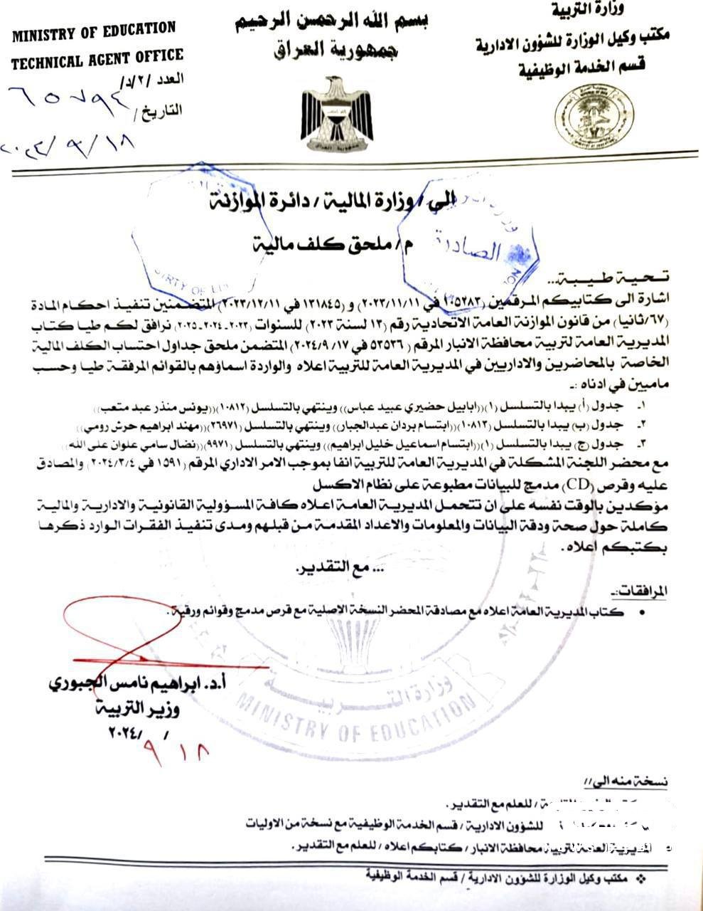 صادق وزير التربية إبراهيم نامس الحبوري، اليوم الأربعاء، على محاضر ملحق العقود لمديرية تربية الأنبار.